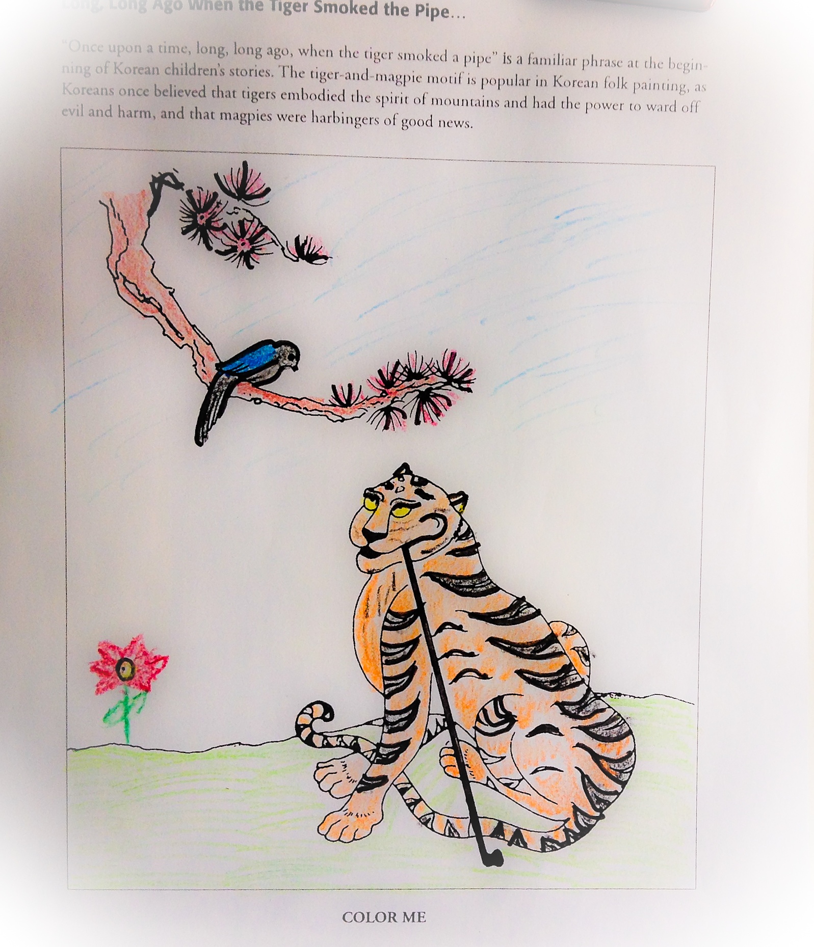 Beneath the above quoted passage lay an attractive coloring page that depicted a smoking tiger and a magpie of the kind that are commonly found in Korean folk paintings.  At the bottom of the page in capital and bold black letters was the directive, COLOR ME.    It was such a striking image that I really couldn’t help myself and as I teach children between the ages of three and nine years old, I always have crayons and markers at my disposal.  So, while I should have been prepping for my afternoon lesson, I grabbed a set of crayons and went to work.  I haven’t put crayon to coloring book in ages – let’s say 10 years or more. As I meticulously filled in the page I found myself becoming more relaxed; I even found myself smiling. And like a five year old, when I was finished, I proudly affixed my “masterpiece” to the refrigerator door with a magnet.