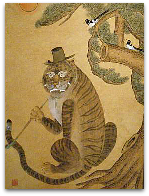 I thought it was both a curious expression and a delightful mental image, so I logged onto the net to do a little investigating.  After inputting a few appropriate keywords, I was directed to a 21-page student oriented pdf document about Korean Myths and Folktales that had been prepared by the San Francisco Asian Art Museum. On page 19 of the pdf document there was a short explanation of the smoking tiger idiom.